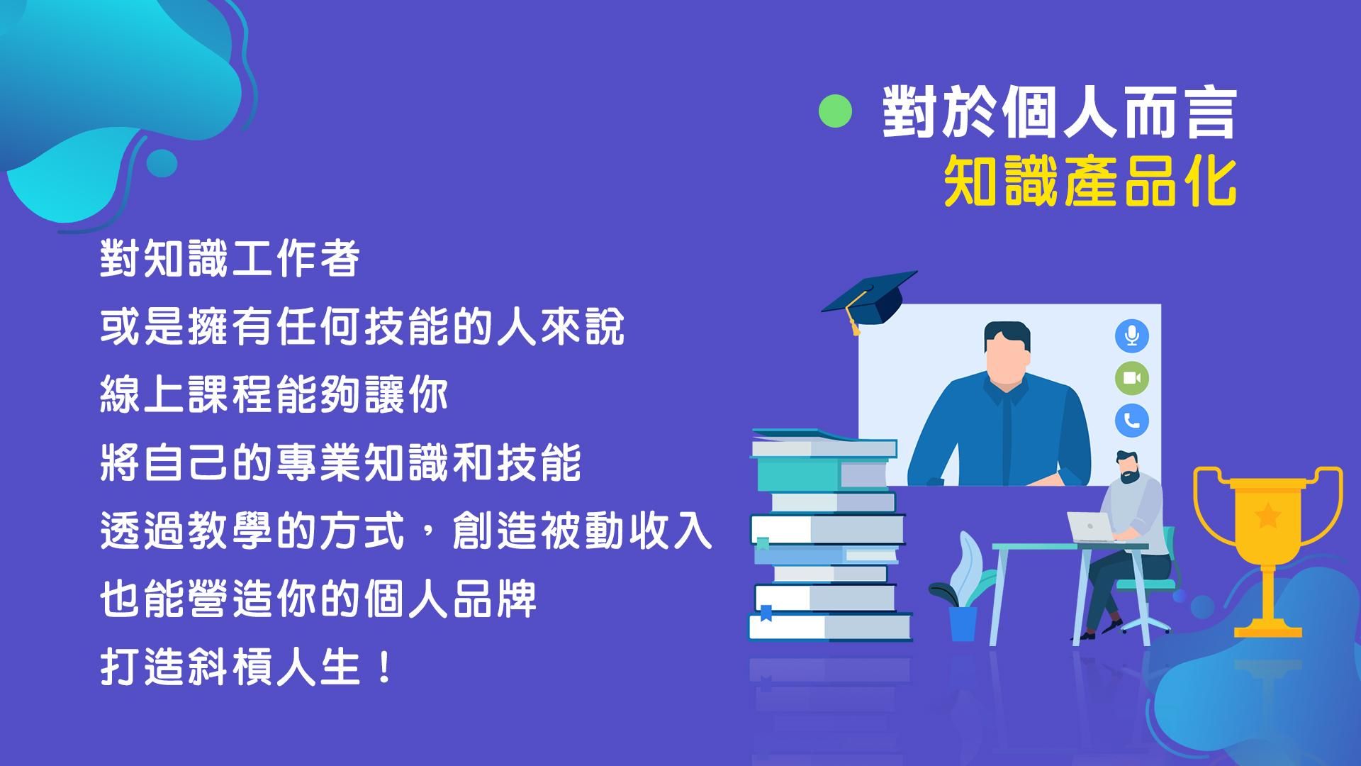 線上課程能夠讓你將自己的專業知識和技能透過教學的方式創造被動收入,也能營造你的個人品牌,打造斜槓人生!