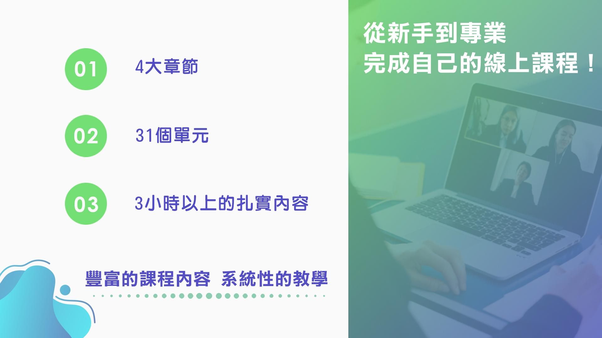 課程內容共 31 個單元•總時數約 3.2 小時