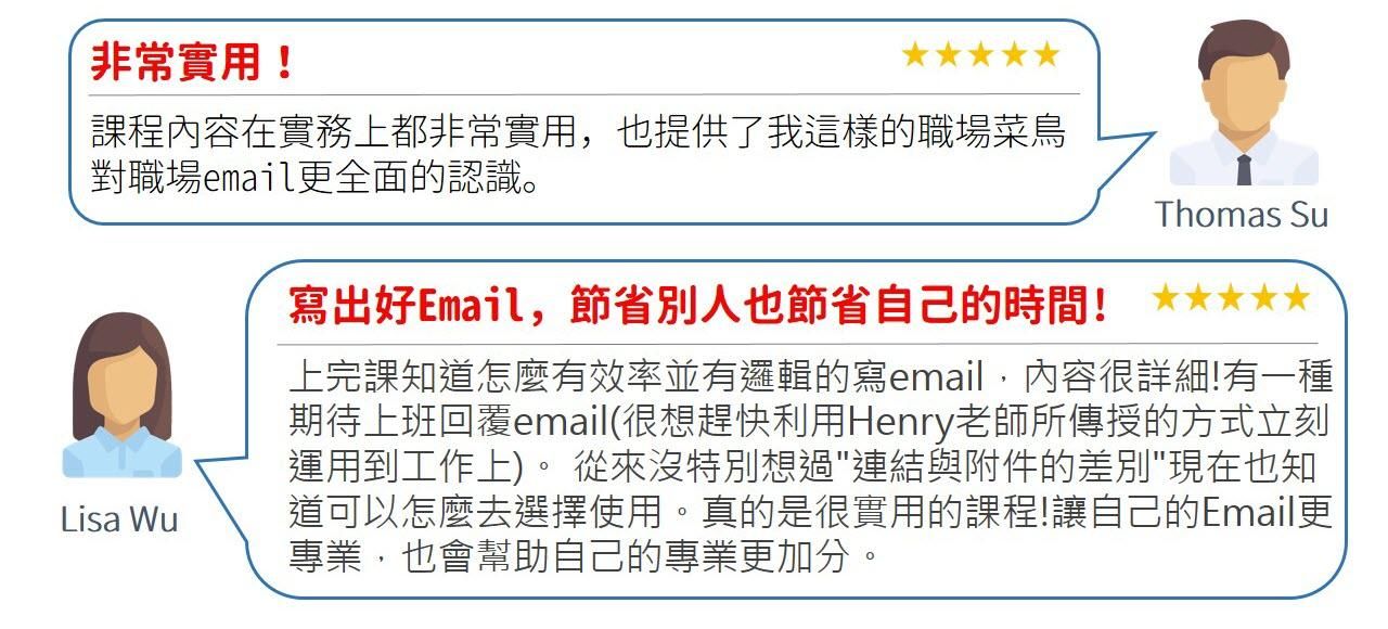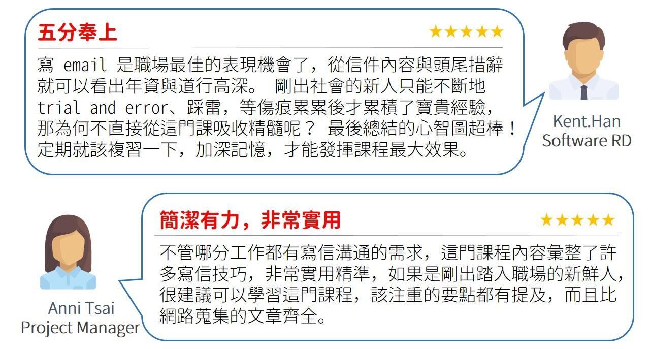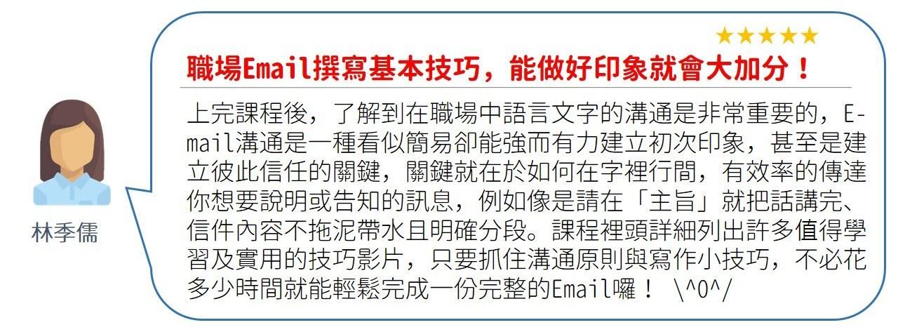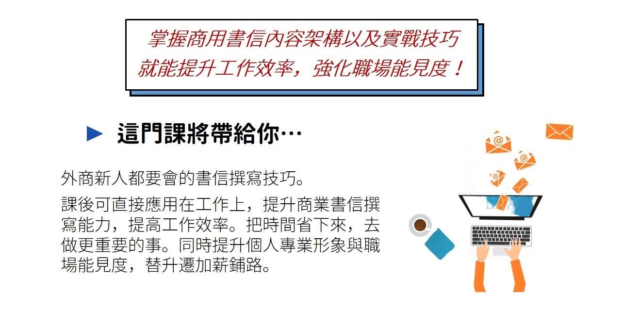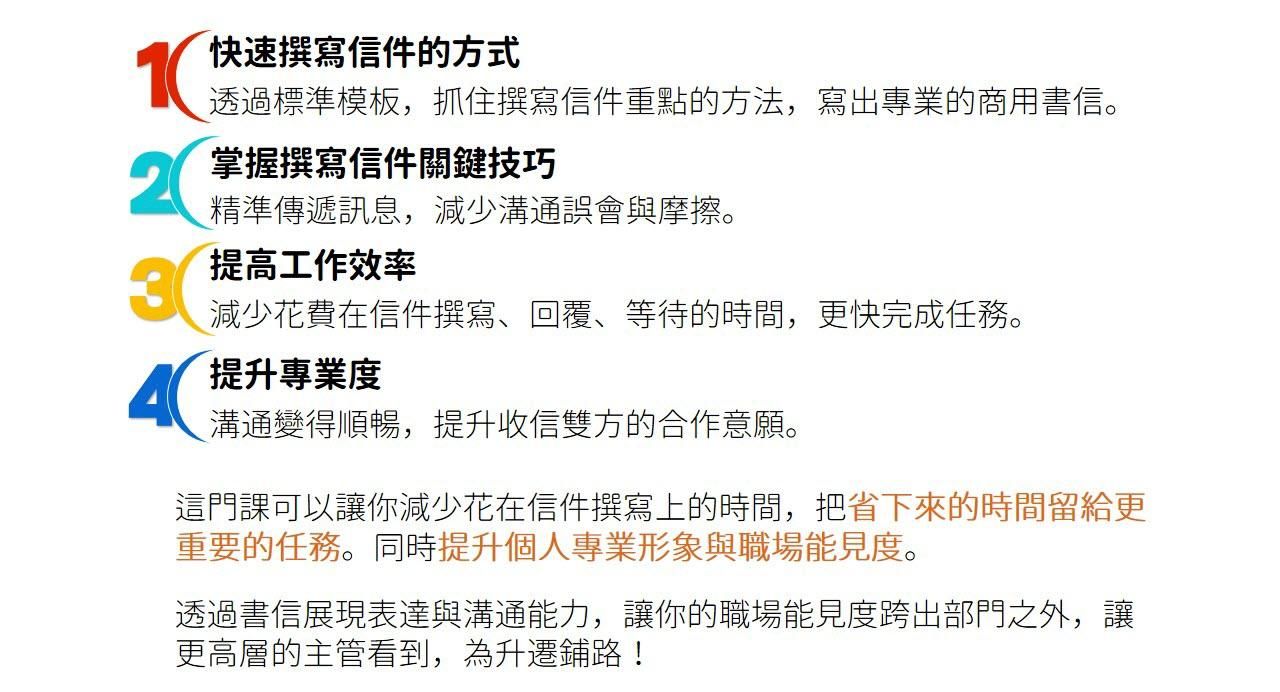 課後可直接應用在工作上,提升商業書信撰寫能力,提高工作效率。同時提升個人專業形象與職場能見度,替升遷加薪鋪路。
