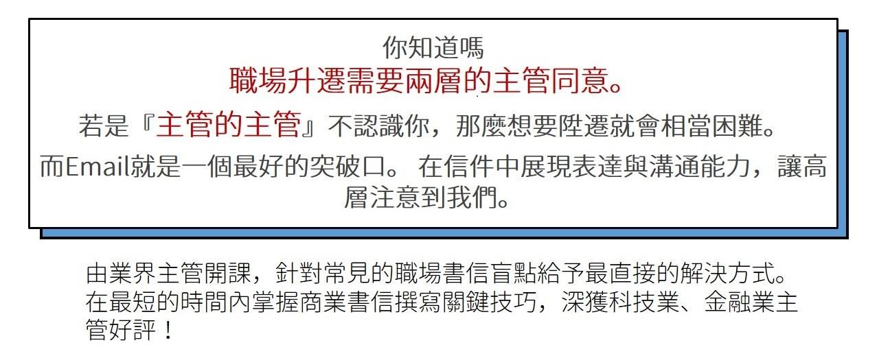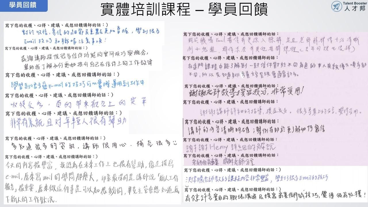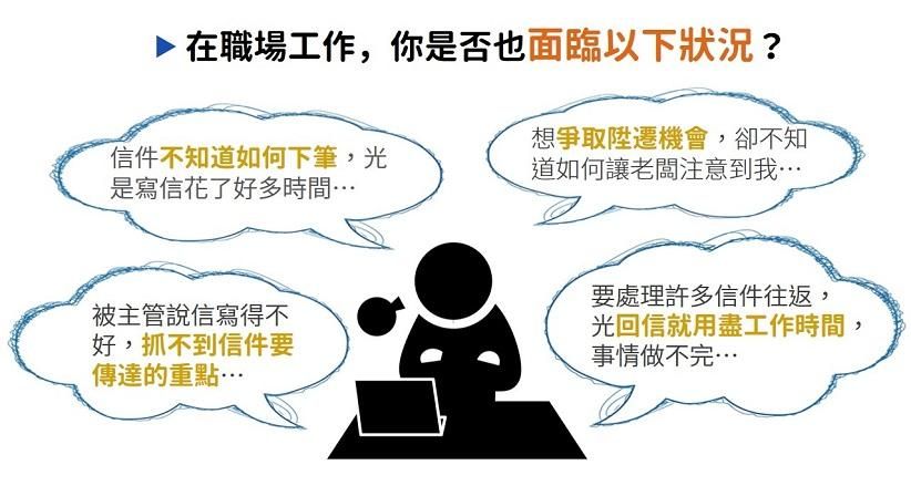 業界主管開課,針對常見的職場書信盲點給予最直接的解決方式。在最短的時間內掌握商業書信撰寫關鍵技巧,深獲科技業、金融業主管好評。