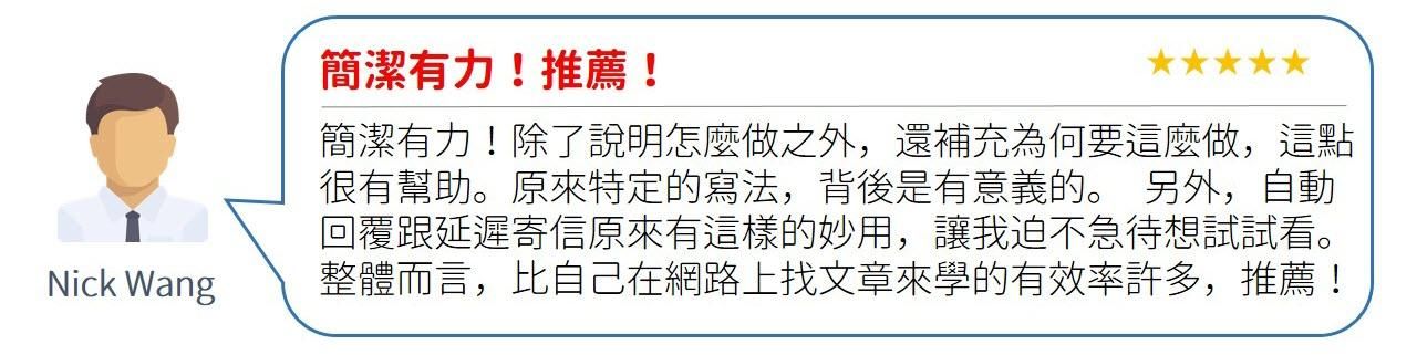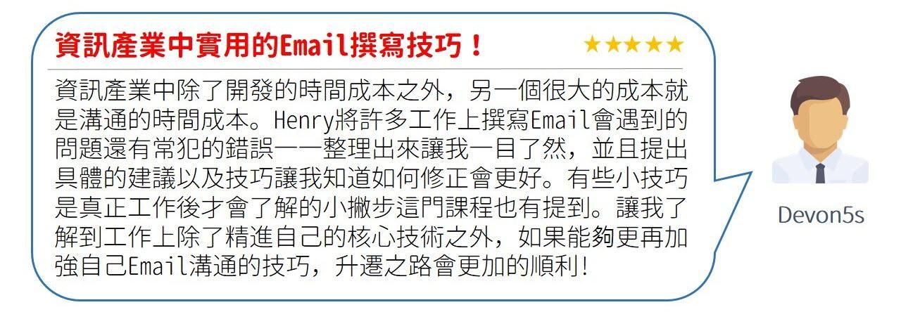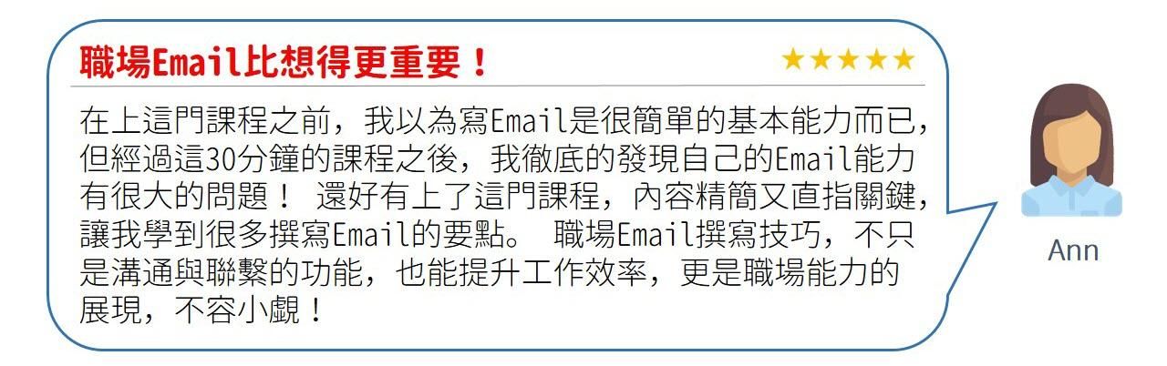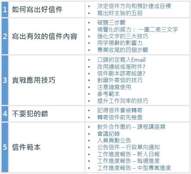 短時間內掌握到Email撰寫的溝通重點,從案例中找出自己曾經犯過的寫作錯誤,並做實際改寫信件的練習,加強學習效果。